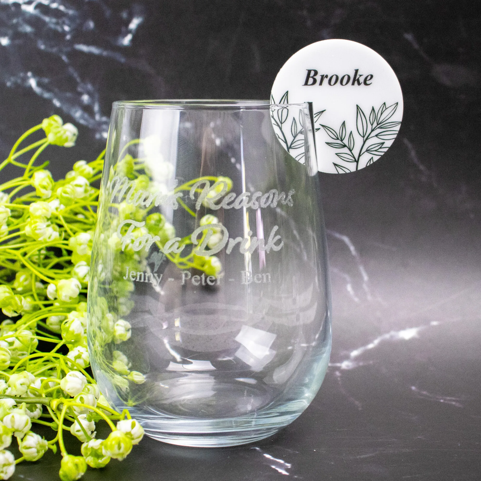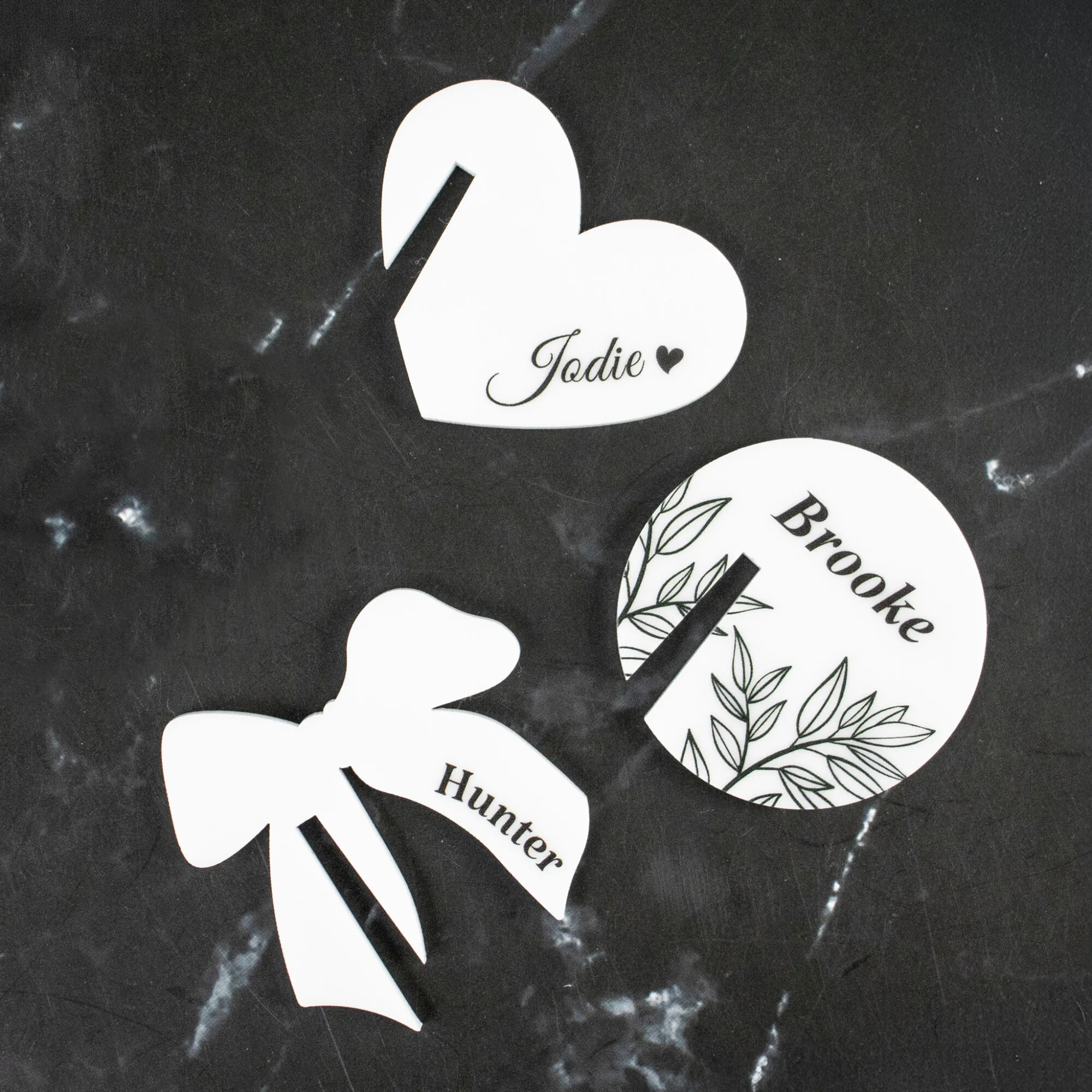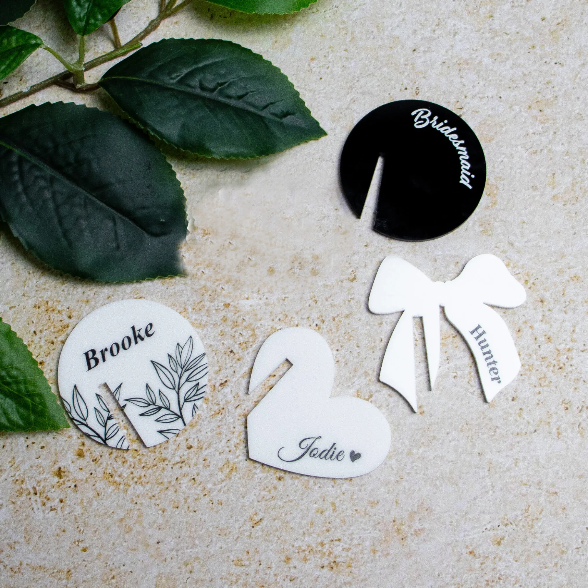 You have the fantastic option to choose either a pack of 4 (perfect for smaller gatherings or family) or a generous pack of 24 (ideal for bigger celebrations!). And to perfectly match your party’s theme, you also get to choose your acrylic colour: either crisp white acrylic with sleek black personalisation, or sophisticated black acrylic with striking white personalisation. Whichever you choose, the contrast ensures your names pop! Each tag is expertly crafted from durable 3mm acrylic and measures a perfect 50mm x 52mm x 3mm – just the right size to be noticeable yet discreet. The clever gap at the top measures 2mm in width, designed to easily slide onto the rim of most wine glasses, cocktail glasses, or even beer schooners.