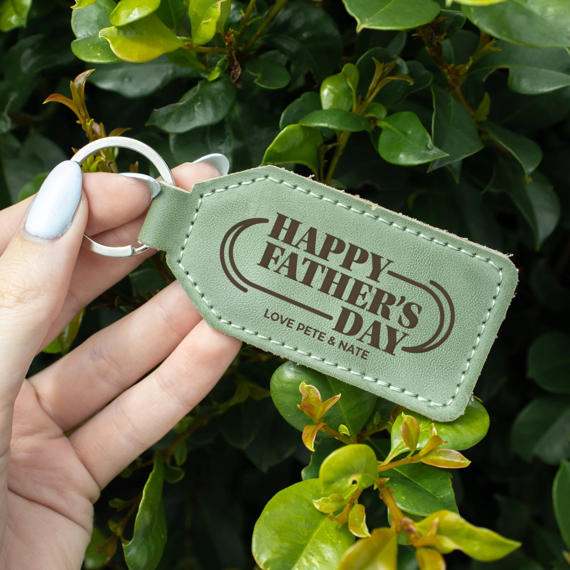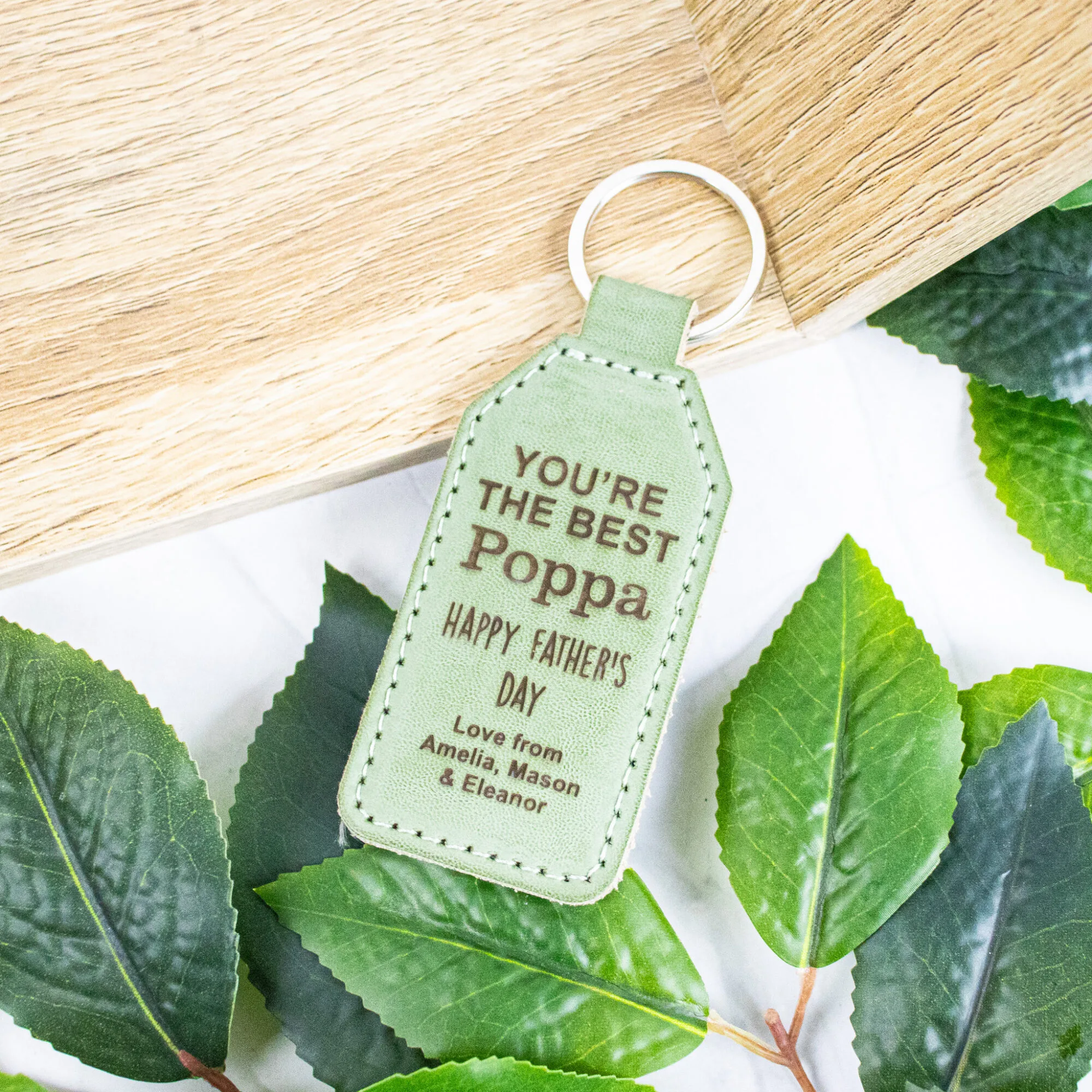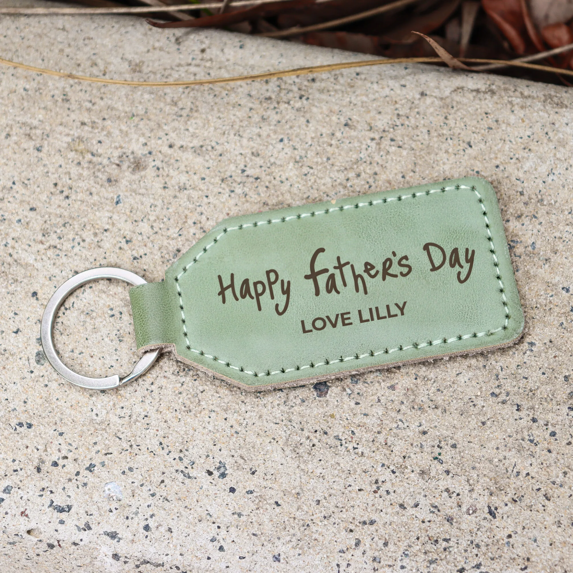 Crafted from high-quality green leatherette, this keychain combines durability with a sophisticated aesthetic. Its smooth texture and refined finish make it a pleasure to hold and a stylish accessory for any set of keys, ensuring Dad carries a piece of your heart with him always.