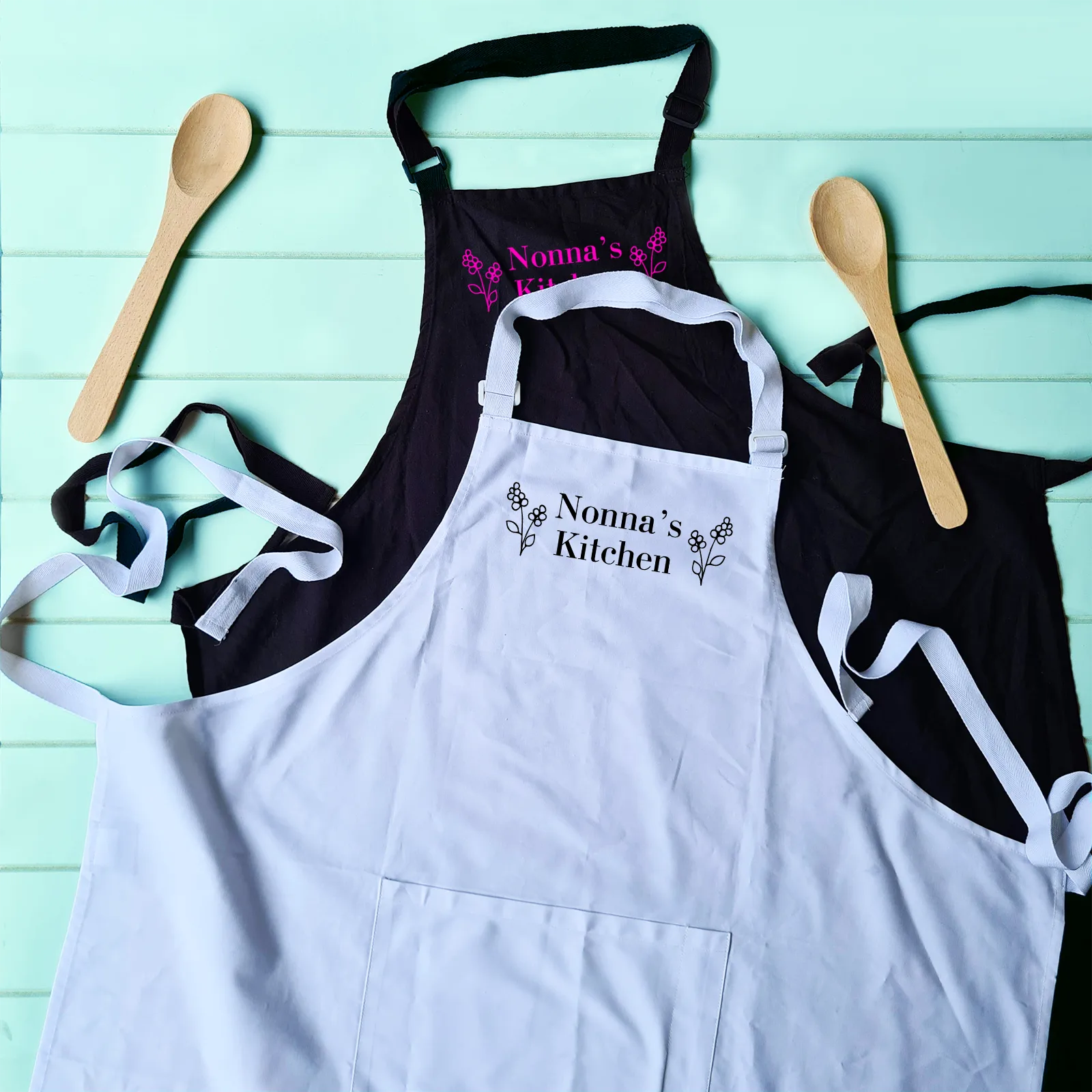 Q: How does the name personalisation work with “Kitchen”? Is it only for “Nonna”? A: Not at all! While “Nonna’s Kitchen” is a lovely classic, you provide the name or phrase you want (e.g., “Grandma’s”, “Chef Dave’s”, “Our Happy Place”), and we embroider that with the “Kitchen” design element. Type it exactly as you want it to read!