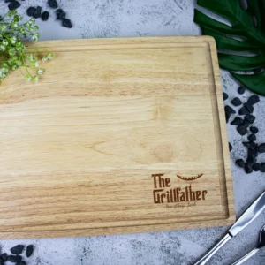 Elevate Dad’s barbecue reign with our “Grillfather” Chopping Board – the ultimate throne-worthy gift for the ruler of the flame! This isn’t just kitchenware; it’s his official coronation as the culinary boss, personalised with your heartfelt message beneath the iconic “Grillfather” title. Watch his face light up as he unwraps this stunning tribute to his grilling mastery, ready to command the barbecue or smoker with legendary style. Crafted from premium natural tropical wood, this board exudes character and substance with its impressive 350mm x 260mm x 30mm dimensions and solid 2.8kg weight. It’s built for serious food prep – whether he’s slicing championship steaks or carving slow-cooked brisket – while the laser-engraved design and your custom message create a permanent, stylish keepsake he’ll treasure for years. The crisp engraving won’t fade or wash away, surviving countless barbecue seasons as his trusty sidekick.